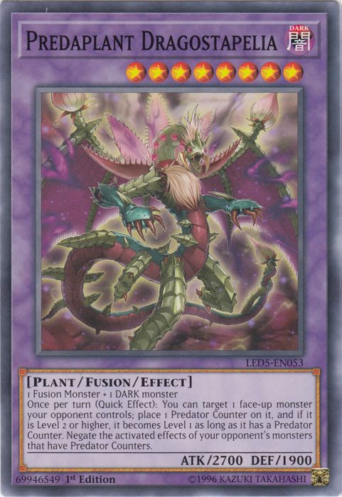 1 Fusion Monster + 1 DARK monster Once per turn (Quick Effect): You can target 1 face-up monster your opponent controls; place 1 Predator Counter on it, and if it is Level 2 or higher, it becomes Level 1 as long as it has a Predator Counter. Negate the activated effects of your opponent's monsters that have Predator Counters.