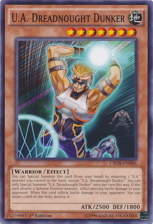 You can Special Summon this card (from your hand) by returning 1 "U.A." monster you control to the hand, except "U.A. Dreadnought Dunker". You can only Special Summon "U.A. Dreadnought Dunker" once per turn this way. If this card attacks a Defense Position monster, inflict piercing battle damage to your opponent. When this card inflicts battle damage to your opponent: You can target 1 card on the field; destroy it.