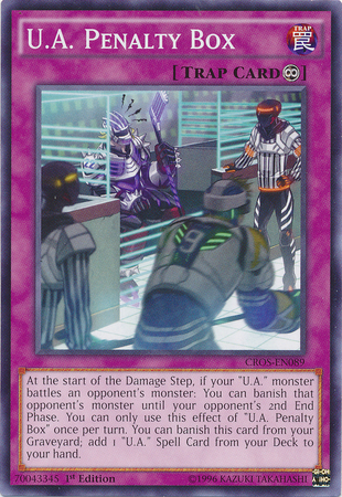At the start of the Damage Step, if your "U.A." monster battles an opponent's monster: You can banish that opponent's monster until your opponent's 2nd End Phase. You can only use this effect of "U.A. Penalty Box" once per turn. You can banish this card from your Graveyard; add 1 "U.A." Spell Card from your Deck to your hand.