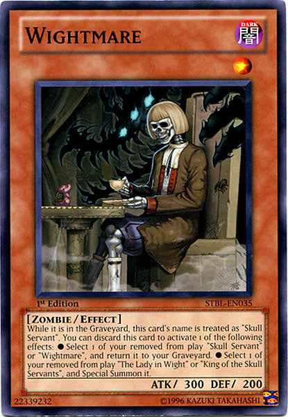 While it is in the Graveyard, this card's name is treated as "Skull Servant". You can discard this card to activate 1 of the following effects: ●Select 1 of your removed from play "Skull Servant" or "Wightmare", and return it to your Graveyard. ●Select 1 of your removed from play "The Lady in Wight" or "King of the Skull Servants", and Special Summon it.