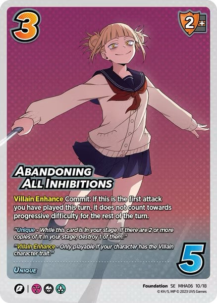 Villain Enhance Commit: If this is the first attack you have played this turn, it does not count towards progressive difficulty for the rest of the turn." Unique - While this card is in your stage, If there are 2 or more coples of it in your stage, destroy 1 of them." " Villain Enhance - Only playable if your character has the Villain character trait."