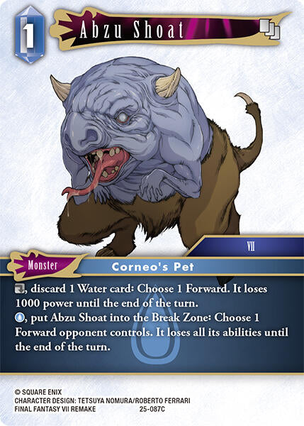 Water, put Abzu Shoat into the Break Zone: Choose 1 Forward opponent controls. It loses all its abilities until the end of the turn.